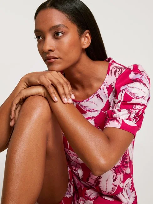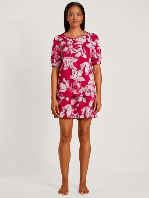 Verspielte Details und der opulente Blumenprint bringen den Kurz-Pyjama aus der BLOOMING NIGHTS Serie von CALIDA zum Leuchten. Weiche Supima®, Baumwolle mit swiss+cotton-Gütesiegel umschmeichelt die weibliche Silhouette angenehm und verzaubert mit tollem Tragegefühl. Die leichten Puffärmel sorgen neben dem grossflächigen Papageientulpenprint für einen weiteren Hingucker.