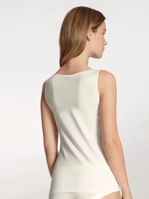 Schlichtes, elegantes Tank-Top aus der Serie CATE von CALIDA. Die Charmeuse-Blende am Dekolleté verleiht dem Shirt ohne Arm einen edlen Look. Besonders praktisch ist, dass die Träger in ihrer Breite so verarbeitet wurden, dass die BH Träger nicht hervorblitzen.