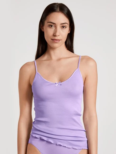Edles, gerade geschnittenes Spaghetti-Top aus seidiger, mercerisierter Baumwolle. Ausschnitt zart mit einem glänzenden Satinbändchen eingefasst. Das schmückende kleine Schleifchen kann ohne Probleme abgetrennt werden.