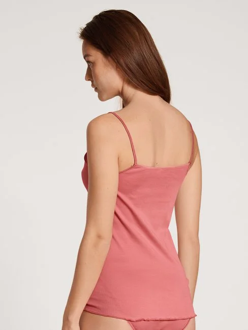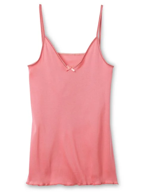 Edles, gerade geschnittenes Spaghetti-Top aus seidiger, mercerisierter Baumwolle. Ausschnitt zart mit einem glänzenden Satinbändchen eingefasst. Das schmückende kleine Schleifchen kann ohne Probleme abgetrennt werden.
