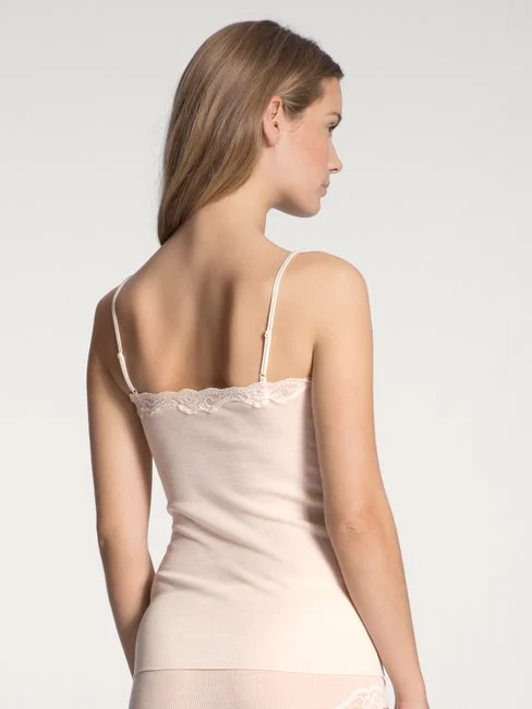 Spaghetti-Top aus der Serie RICHESSE LACE mit zarter Spitze und verstellbaren Trägern. Die bewährte CALIDA Wolle/Seide-Unterwäsche ist kuschelig warm und schmeichelt zugleich empfindlicher Haut. Das natürliche Fasergemisch ist leicht und temperaturausgleichend und somit nicht nur für die kalte Jahreszeit ein ideales Darunter.