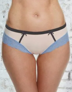 „Holly“ kombiniert zarte Spitze in Taubenblau mit pfirsichfarbenem Grundton und dunkelgrauen Akzenten.